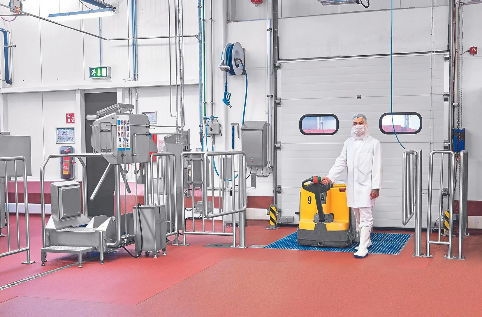 Zudem war die Vorgabe der Betriebsleitung Perwenitz, dass die doppelflügelige Haftmagnet-Toranlage erst ein Öffnungssignal für das Einfahren der Flurförderfahrzeuge erhält, wenn die Mitarbeiterinnen und Mitarbeiter den Personalhygieneprozess durchlaufen haben und sich an der Hygieneschleuse mit einem sogenannten „Badge“ für den Zutritt autorisiert haben.