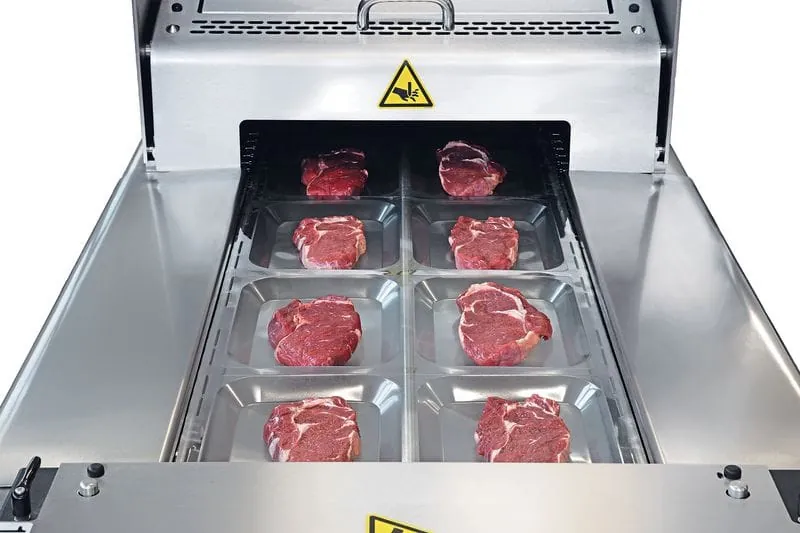 Einen größeren Durchsatz hingegen bewältigt der vollautomatische Traysealer T 300. Das Einstiegsmodell eignet sich zum effizienten Verpacken verschiedenster Produkte auf kleinstem Raum und kann mehrspurig ausgelegt sowie mit verschiedenen Abführsystemen kombiniert werden. Dank des einfachen Werkzeugwechsels lässt sich die Maschine schnell für verschiedene Verpackungsgrößen und -formen umrüsten, so dass sie kleinen wie größeren Betrieben eine ideale Kombination aus Leistungsfähigkeit und Flexibilität bietet. Elektrische Antriebssysteme für den Traytransport, das Hubwerk und ein Folienrestwickler sorgen für eine energieeffiziente Arbeitsweise. Dank der IPC06-Steuerung mit Touchscreen ist die Bedienung besonders benutzerfreundlich und auch für ungeübtes Personal möglich.