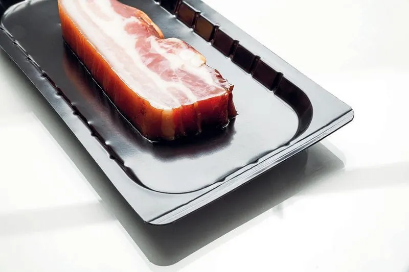 Durch die vollflächige Versiegelung der Oberfolie mit der Unterfolie beziehungsweise dem Tray wird zudem der Austritt von Produktflüssigkeit reduziert. Das Packgut ist in der Schale sicher fixiert, so dass es nicht verrutschen kann und sich stehend, liegend oder auch hängend in der Kühltheke präsentieren lässt. Bei der Tiefkühllagerung schützen Vakuum-Skinverpackungen darüber hinaus zuverlässig vor Gefrierbrand. Die Vakuum-Skinverpackungen eignen sich für Fleisch und Wurstwaren ebenso wie für Pasteten und sogar Hackfleisch.
