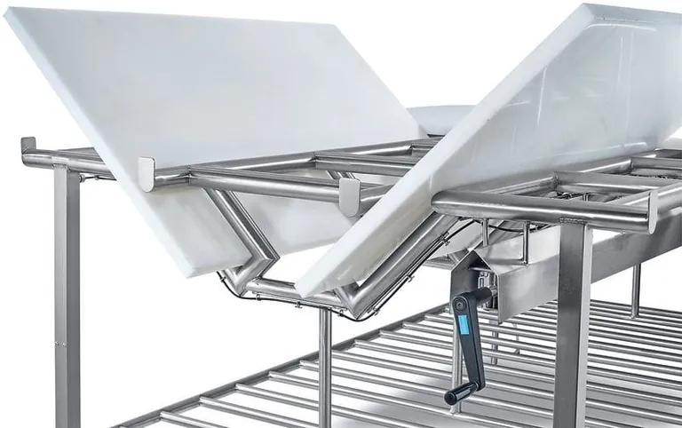 Highlight des neuen „Hygienic-Design“ Zerlegetisches ist, dass die Kunststoff-Schneidplatten nicht mehr umständlich zur Reinigung vertragen werden müssen. Mit Hilfe einer speziellen Haltevorrichtung am Tisch können die Schneidplatten einfach schräg gestellt werden. Der Arbeitstisch selbst ist aus hygienischen Rundrohrprofilen konzipiert.