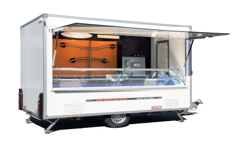 Je nach Bedarf kann der Anhänger Serrano auch an entsprechende Kundenbedürfnisse angepasst werden, zum Beispiel durch Erweiterung um einen Imbiss- oder Käsebereich. Außerdem bietet Wörmann individuelle Designmöglichkeiten wie stationäre oder klappbare Leuchtreklamekästen, Werbetafeln, Außenbeschriftung oder Einplanungen.www.woermann.eu