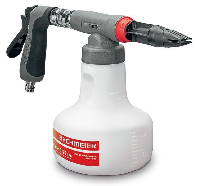 Weitere Leistungs- und Qualitätsmerkmale der neuen Vario-Matic 1.25 PE sind das ergonomisch geformte Handventil und die Schnellkupplung für den Schlauchanschluss. Der breitgeformte 1,25-l-Konzentratbehälter ist standsicher und verfügt über Griffmulden für einfaches Öffnen und Schließen, über eine Literskala sowie Dosier­angaben (Verhältnis und Prozent).