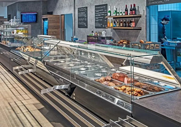 Mit der Heißen Theke von Schrutka-Peukert werden je nach Anforderung, Tageszeit und Saison Fleischgerichte, Beilagen, Saucen und Suppen präsentiert. Dabei lässt sich die Heiße Theke je nach Bedarf einfach von feuchte Hitze (Wasserbad) auf trockene Hitze (Unterhitze) umstellen.