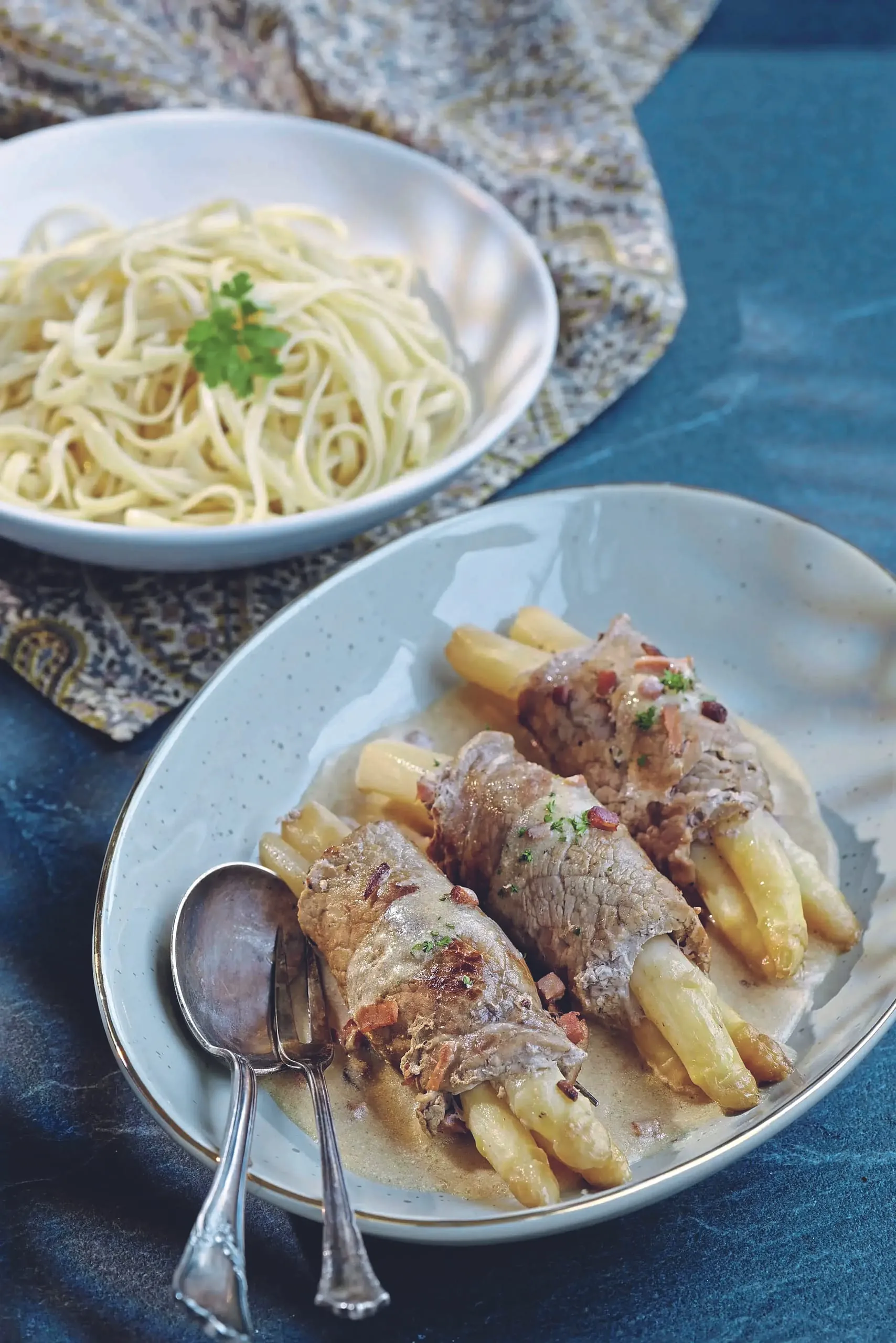 Rouladen gehören zu den Klassikern der deutschen Küche – traditionell zubereitet aus der Oberschale vom Rind. In dieser Variante wird das beliebte Fleischgericht neu interpretiert: mit zartem Kalbfleisch und einer Füllung aus weißem Spargel und Schinken. Der Spargel, nicht umsonst auch „Königsgemüse“ genannt, galt schon im alten Rom als Delikatesse und steht bis heute für feinen Genuss. Eine exklusive Kombination, die Frühlingsaromen in Szene setzt.