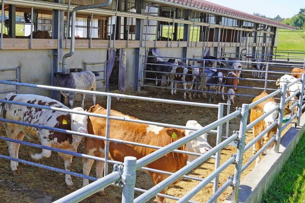 Auch die Rinder werden in offenen Stallungen auf Stroh gehalten. Sie bekommen ebenfalls bestes Futter nach Qualivo-Konzept, das aus betriebseigenem Getreide, pflanzlichem Eiweiß, Kräutern, Mineralstoffen und Vitaminen besteht. Sojaschrot oder gentechnisch veränderte Futtermittel sind verboten. Bei der Rasse setzt Russ auf das seit 200 Jahren in Baden-Württemberg und Bayern beheimatete Fleckvieh, das aufgrund seiner Schweizer Urheimat auch als Simmentaler Rind bekannt ist. Landbauern Rind fällt unter die Haltungsform 3.