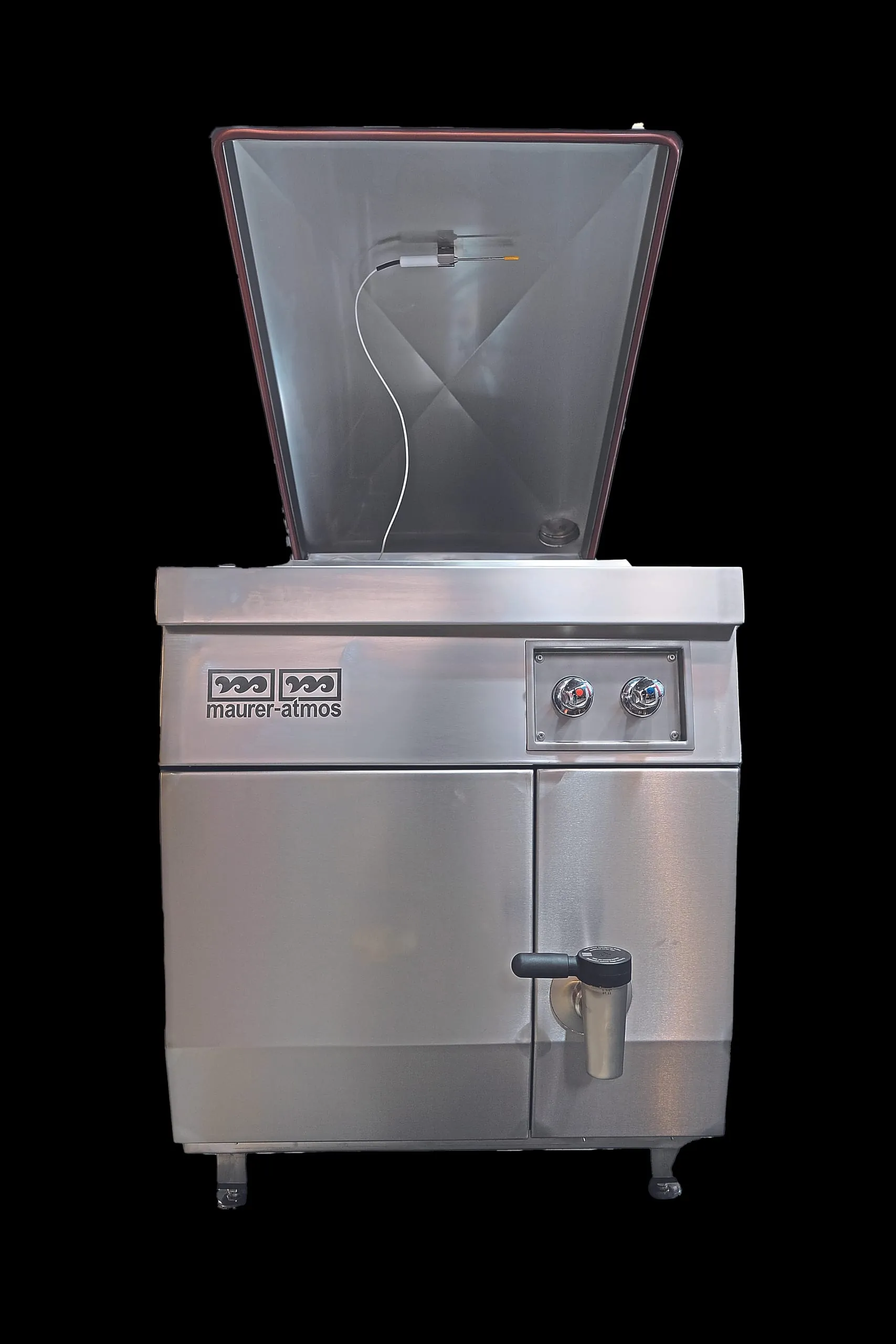Der Kochkessel ist eine energiesparende und universell einsetzbare Lösung für alle Kochprozesse in verschiedenen Aufstellungsvarianten. Ob für schwimmende oder an Spießen hängende Produkte, die flexiblen Kochkessel von Maurer-Atmos Middleby, Reichenau, lassen sich mit Hängebahnen und Körben optimiert individualisieren. Durch den hinten auf dem Kesselrand angeordneten Wassereinlauf ist die Wasserbefüllung mit geschlossenem Deckel möglich. Neben der Ausführung mit Fuß, gibt es alle Kochkessel auch in Sockelausführung.