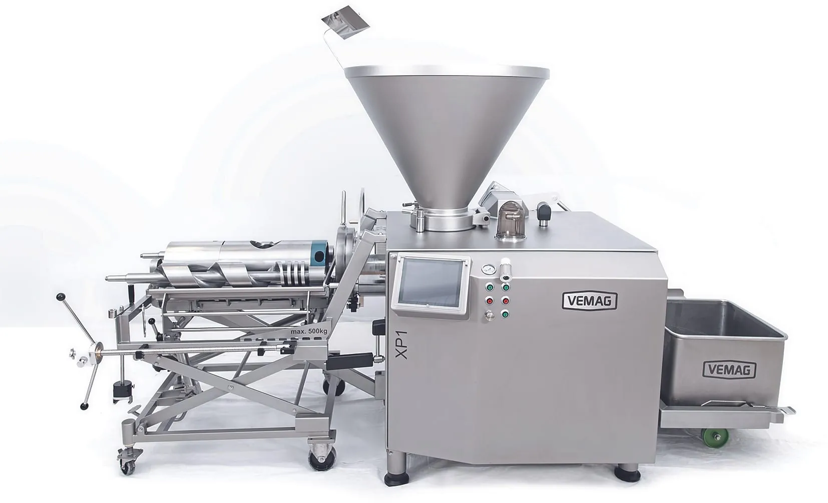 Peter Faden produziert mit der XP1 hauptsächlich Kochschinken. Dazu kommen noch Rohwurstprodukte, die ebenfalls mit der Maschine hergestellt werden. Das fett- und sehnenfreie Fleisch für die Kochschinkenherstellung stammt traditionell aus den vier hinteren Muskelpartien des Schweins: Hüfte, Nuss, Ober- oder Unterschale. Aber auch Geflügelfleisch kann problemlos verarbeitet werden. Wichtig bei der Produktion ist, dass die Muskelstruktur erhalten bleibt. „Die Füllmaschine sorgt dafür, dass die wertvollen Fleischstücke – nur so kann ein qualitativ hochwertiger Kochschinken entstehen – bestehen bleiben“, erläutert Maximilian Winter. „Zudem müssen Hohlstellen, die den Geleeabsatz begünstigen, vermieden werden, um den optimalen Zusammenhalt des Endprodukts zu gewährleisten“, erklärt der Geschäftsführer weiter. Der Aufbau der XP1 gewährleistet, dass qualitativ hochwertige Produkte entstehen. So verfügt die Füllmaschine über besondere Merkmale wie den Vemag Duo Drive. Ein Antrieb sorgt für die individuelle Steuerung des Zubringers. Das Füllgut wird dadurch optimal der Förderkurve zugeführt.