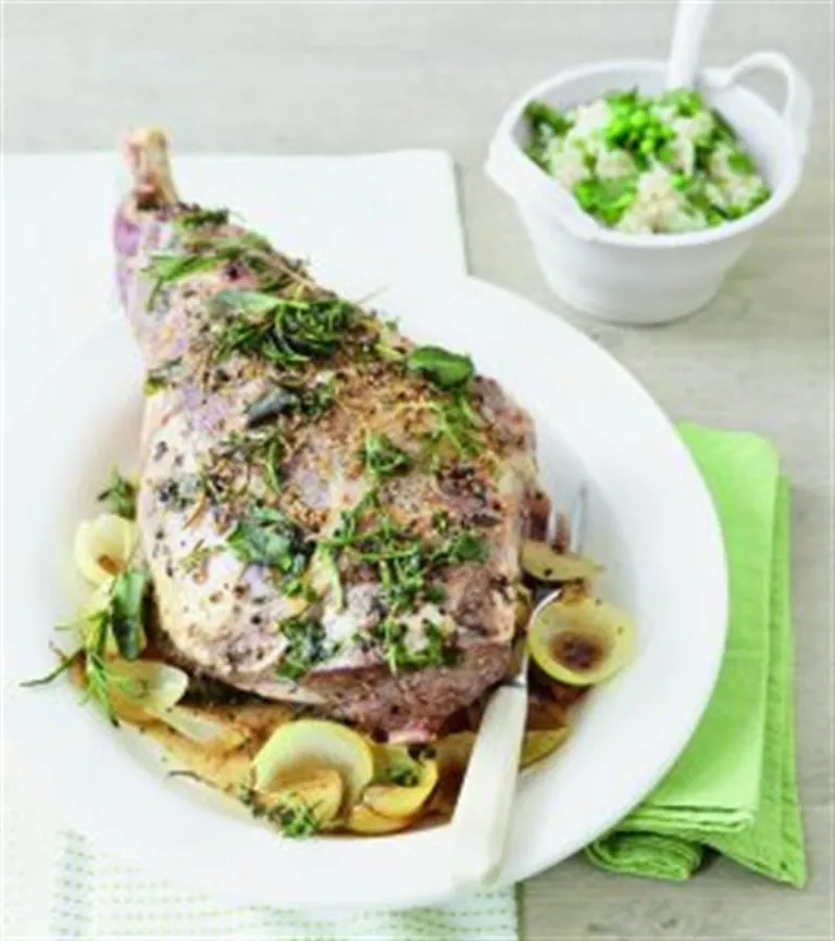 Kräuterlammkeule und Erbsenrisotto