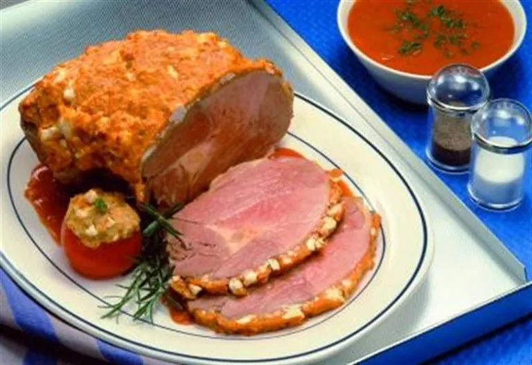 Lammkeule mit Pfeffer, zerdrücktem Knoblauch und Salz würzen. Butterschmalz in einen Bräter geben, Fleisch hineinsetzen, Zwiebelstücke zugeben. Bei 175–200 °C (Elektroherd;Gasherd:Stufe 2–3) 1 bis 1 ¾ Stunden braten; zwischendurch mit Wein und Wasser ablöschen. Fleisch ab und zu mit Bratenfond beschöpfen. Zutaten für die Käsekruste verrühren. Nach ca. 1 Stunde über die Keule geben (bis auf etwas Masse für die Tomaten). Bratenfond mit Crème fraîche binden und durchkochen lassen. Abschmecken. Halbierte Tomaten mit Käsemasse krönen und zum Schluss mitgaren. Das geschnittene Fleisch mit Rosmarin garnieren.CMA