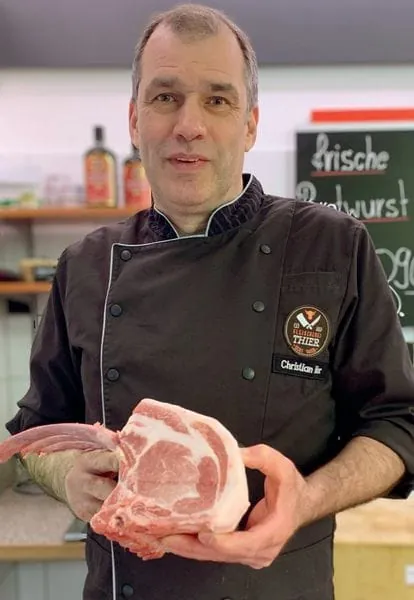 Auch Metzgermeister Christian Thier aus Münster hat das Duroc IMF getestet. Sein Urteil: „Es ist ein wunderbar trockenes, eher dunkles und festes Fleisch. Es hat eine sehr feine Marmorierung. Man sollte genau hinschauen, um die vielen feinen Fettfasern klar zu erkennen. Diese Marmorierung ist über das ganze Tier hin gleichmäßig und durchzieht den Muskel vollständig.“ Bei der Zerlegung gilt für Christian Thier, dass ein besonderes Schwein auch eine besondere Schnittführung erfordert: Dabei werden etwa Koteletts, Holzfällersteaks von der Schulter oder Hüftsteaks so geschnitten, dass jeweils 0,5 bis 1 cm Speck am Fleisch bleibt. Der Kotelett-Nackenstrang wird in drei Teile unterteilt, das mittlere heißt „Entrecôte vom Schwein“. Christian Thier bekräftigt: „Mir geht es um zweierlei: Erstens will ich zeigen, dass alle Cuts, die wir vom Rind kennen, genauso beim Schwein gehen. Zweitens will ich den Kunden in kleinen Schritten die Angst vor dem Fett nehmen.“