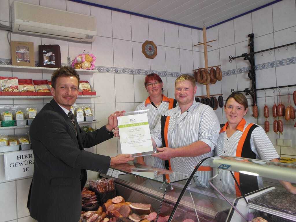 Euroweb-Medienberater Jack Anderson hat Fleischermeister Thomas Geier den IMA Award für seine ausgezeichnete Website überreicht. Mit Geier freuen sich seine Frau (rechts) und Mitarbeiterin Tanja Born. - © Euroweb