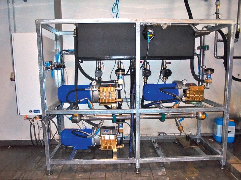 Für den Standort Vilshofen hat der Geschäftsbereich Platz der BIBKO Umwelt- und Reinigungstechnik GmbH, Beilstein, nun die zweite, stationäre 3-Pumpen-Anlage zur Betriebsreinigung geliefert und in Betrieb genommen. Die Anlage besteht aus den robusten und seit Jahrzehnten bewährten Pumpen vom Typ P10. Jede Pumpe verfügt über einen Druck von 70 bar und einen Volumenstrom von 55 l/min. Mit einer 3-Pumpen-Anlage kann somit ein maximaler Volumenstrom von 165 l/min bei einem Druck von 70 bar erzielt werden. Dies ermöglicht die gleichzeitige Nutzung mehrerer Hochdrucklanzen während der Betriebsreinigung.