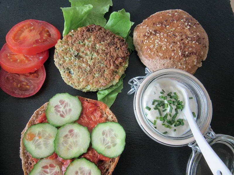 Für vegetarische Varianten bieten sich Gemüse, Ei, Käse an, für vegane Tofu und Hülsenfrüchte. Letztere ergänzen sich mit dem Getreideeiweiß des Buns zu einem hochwertigen veganen Protein. Mit Patties aus Getreide wie Grünkern oder Quinoa hingegen entstehen eiweißarme, kohlenhydratreiche Burger. Salat, Tomaten, Gurken sorgen für knackige Frische und Vitamine.