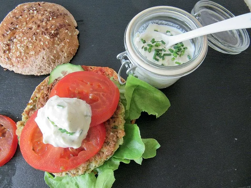 Frisch, saftig, würzig – ein Gemüseburger mit Frischkäse-Joghurt-Cremeschmeckt nicht nur Vegetariern.