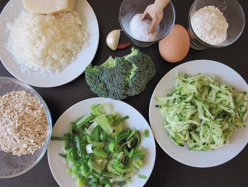 Grünes Saisongemüse, Haferflocken, Ei und Parmesan sind die wichtigsten Zutaten für die vegetarischen Gemüsepatties.