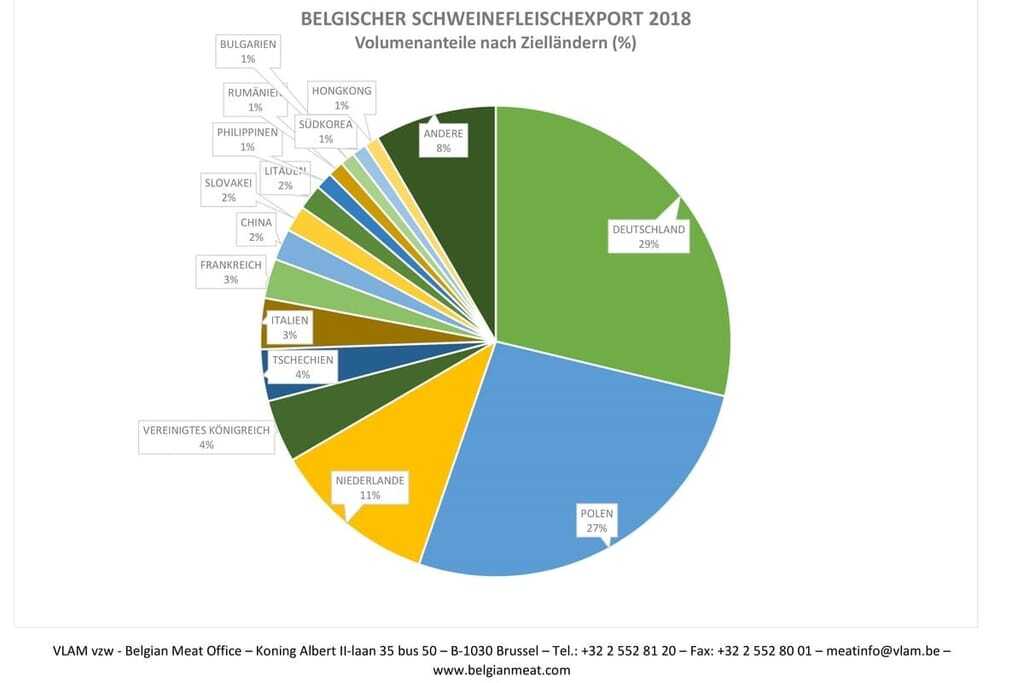 2018 wurden 1,07 Millionen Tonnen Schweinefleisch gewerblich in Belgien erzeugt, das ist rund ein Prozent mehr als vor Jahresfrist. Der Selbstversorgungsgrad bei Schweinefleisch liegt im Königreich bei 222 Prozent. Somit wird der überwiegende Teil der Schweinefleischerzeugung exportiert.
