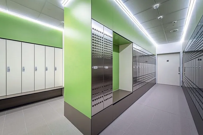 Ein Umkleidebereich in frischem Grün und einer Materialkombination aus HPL und Edelstahl. Sailer - © Sailer