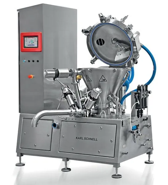 Auf die individuellen Bedürfnisse der Hersteller mit ihren jeweils einzigartigen Produkten reagiert Karl Schnell, Winterbach, mit den multifunktionellen KS Prozessautomaten. Sie vereinigen alle notwendigen technologischen Prozesse der Nahrungsmittelproduktion in einer Maschine: Vorzerkleinern, Dosieren von Wasser und anderen flüssigen Zutaten, Zugabe von pulverförmigen Zutaten auch unter Vakuum, Mischen, Feinstzerkleinern, Umpumpen und Zirkulieren, Vakuumieren, Kochen mit direkter Dampfeinspritzung in das Produkt, Kühlen mit Doppelmantel, Austragen über den Feinstzerkleinerer für feine Produkte, Austragen ohne Feinstzerkleinerer für Produkte mit groben Zutaten und Pumpen zur Verpackung/Abfüllung.