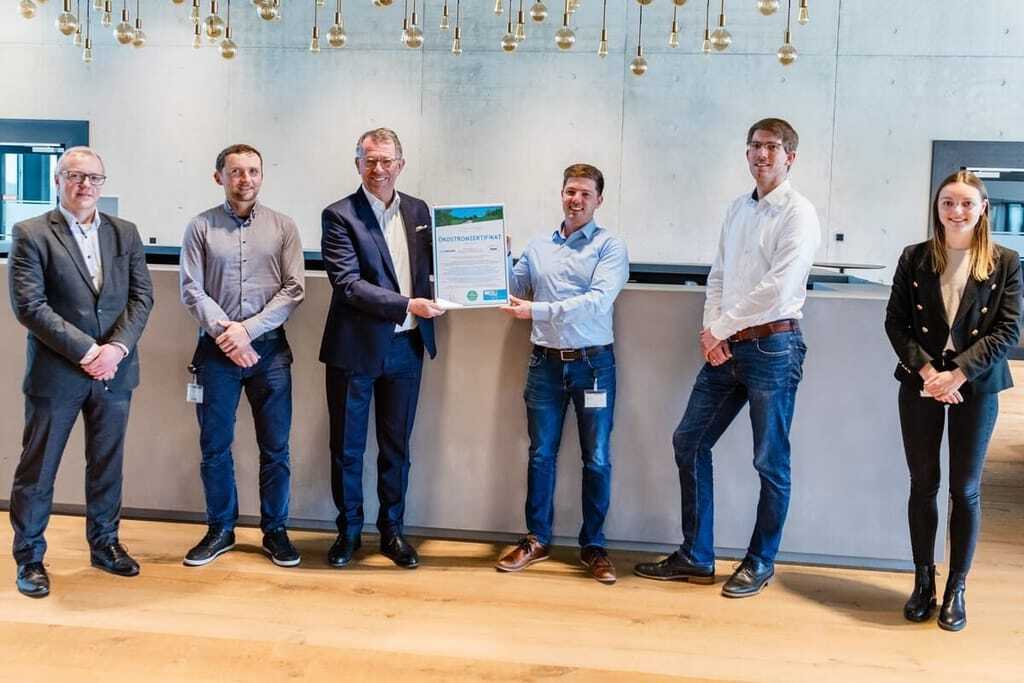 Übergabe des Grünstromzertifikates an Multivac durch TWS (v.l.n.r.): Alexander Hauschke (Multivac), Moritz Naumann (Multivac), Christian Traumann (Multivac), Armin Feser (TWS), Manuel Erens (TWS), Sophia Beck (Multivac). - © Multivac