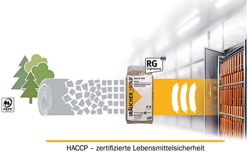 Die HACCP-Zertifizierung der Räucherspäne von JRS ist der Beleg für die Einhaltung der Lebensmittelstandards während des gesamten Räucherprozesses. Das Räuchergold-Engineering-System hat das traditionelle Räucherverfahren für modernste Anlagentechnologie perfektioniert, so das Unternehmen. Optimierte Prozesse, kürzere Räucherzeiten und reibungsloser Anlagenbetrieb ermöglichen kosteneffiziente Endprodukte bei besten Räucherergebnissen.