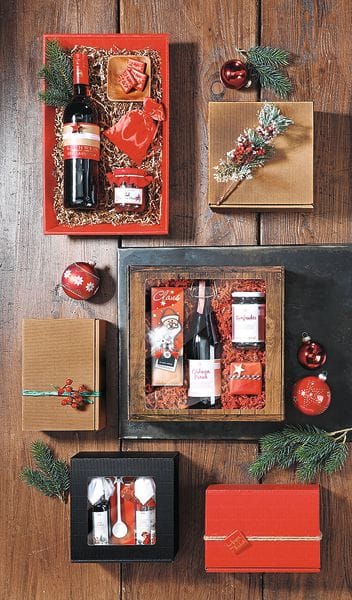 Beim neuen Präsentkarton und der Faltschachtel „Christmas Deluxe“ trifft schwarzer Karton auf glänzende Christbaumkugeln und funkelnde Goldplättchen. Die geschmackvolle Verpackung in drei Größen eignet sich für Getränke oder herzhafte Lebensmittel. Schön und sicher verpackt sind kulinarische Köstlichkeiten im weihnachtlichen Präsentkorb „Knusperhäuschen“.