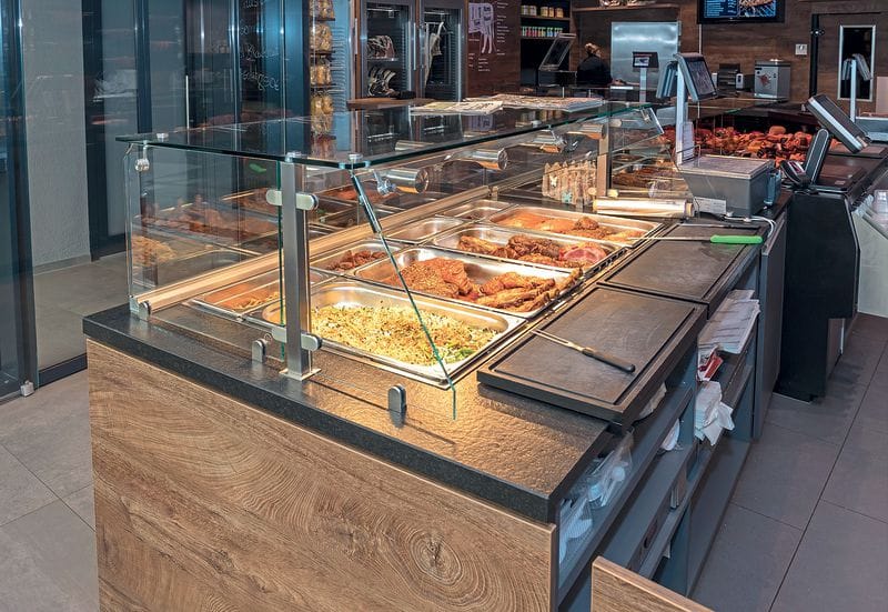 Angesichts der veränderten Konsumgewohnheiten hat sich bfm Ladenbau, Lorch-Waldhausen, der Heißtheke der Zukunft angenommen und seine bisherige Technik weiterentwickelt. Die preisgekrönten Heißtheken überzeugen laut Hersteller mit einer ausgefeilten, zeitgemäßen Technik, die ohne Wasser betrieben wird. Für das gleichmäßige Warmhalten der Speisen sorgt stattdessen ein spezielles Luftführungssystem und die besondere Kombination zweier Wärmequellen: Eine Glaskeramikplatte unterhalb der Gastronomiebehälter (GN-Behälter) schafft eine kompakte, trockene Wärme, die durch Wärmestrahler – eine Exklusivanfertigung von bfm Ladenbau – perfekt ergänzt wird.