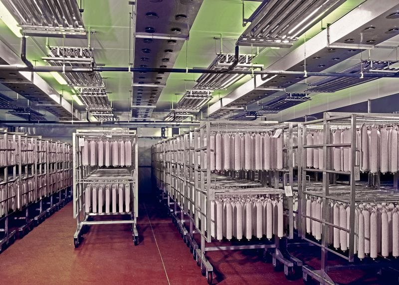 The ripening lines are equipped for optimal ripening of air-dried specialties, from the salting phase to completion. Climatic cold smoking and maturing systems are available for any production quantity. Applied climate-ripening systems in conjunction with enthalpy utilization improve product fermentation. In addition, they enable weight-dependent ripening at the touch of a button. According to the manufacturer, this leads to more product safety and value.