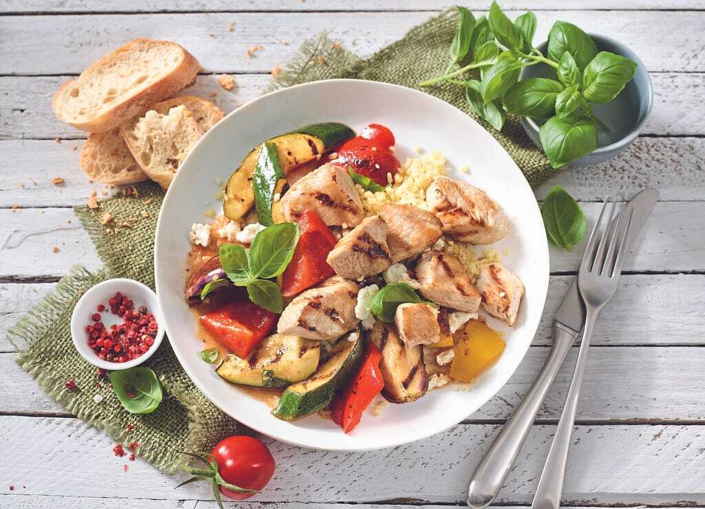 Im Sommer darf’s ruhig leicht, bunt und trotzdem sättigend sein: Der sommerliche Mix aus zartem Putenfleisch, gegrilltem Gemüse, Bulgur und Feta wird kalt serviert und ist damit ideal für warme Tage. Gerade für Fleischer, die ihren Kunden einen abwechslungsreichen Mittags-Imbiss bieten wollen, ist dieser Salat eine attraktive Option.
