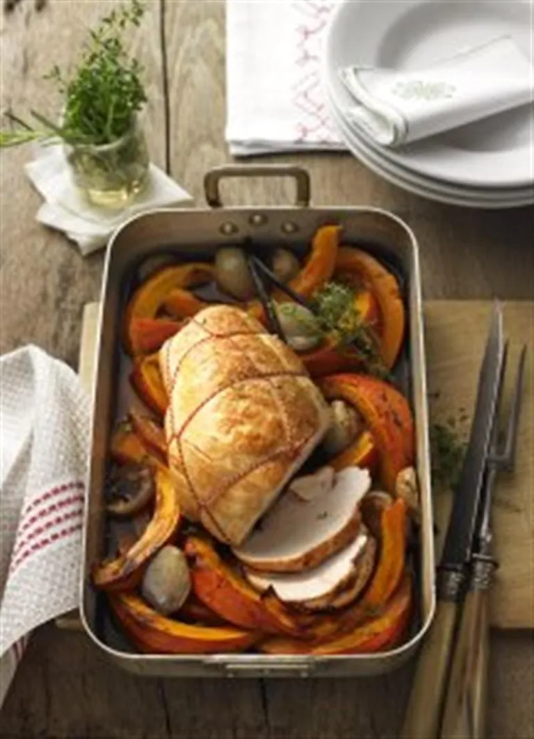 Der Putenbrustbraten mit gebackenem Kürbis, Zwiebeln, Thymian und Vanille ist eine herbstliche Genussidee für die Heiße Theke. - © Deutsches Geflügel