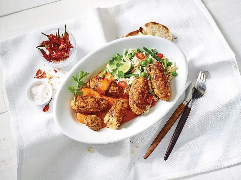 Den Gemüsereis auf Tellern verteilen und die Putenhackfleischröllchen mit der Currysauce darauf anrichten. Mit frischem Koriander, Chili und Limettenspalten genießen!
