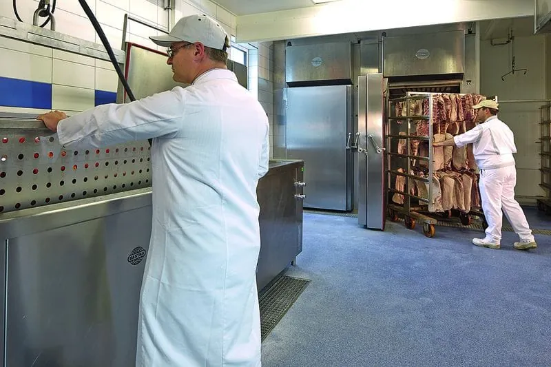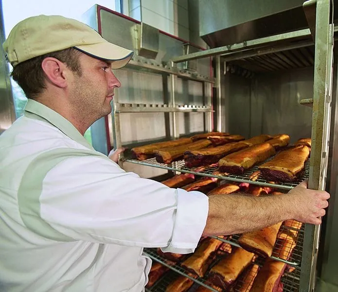 Die nun im Lebensmittelzentrum betriebenen beiden Universal Koch- und Räucheranlagen verfügen jeweils über einen in die Tür eingebauten Reiberaucherzeuger. Ihr Nutzrauminhalt von jeweils 3.000 l beziehungsweise das von der behandelten Ware abhängige Fassungsvermögen von 100 kg bis 400 kg sind für den derzeitigen Kapazitätsbedarf ausgelegt. Diese im geschlossenen System arbeitenden und somit umweltfreundlichen Anlagen setzen während der Räucherphase keine Emissionen frei. Eventuell vorhandener Restrauch wird nach dem Räucherprogramm mittels Wassereinsprühung im Raucherzeuger ausgewaschen. „Trotz eines sparsamen Umgangs mit den Reibehölzern sorgt die robuste Technik schnell für eine starke und effiziente Rauchentwicklung - und das bei sehr geringer Geräuschentwicklung und einem recht hohen Hygienekomfort. Maßgeblich mit ausschlaggebend war aber auch das optimale Raucharoma für unsere Produkte“, fasst Koller die wichtigsten Kriterien für die Entscheidung zugunsten von Reiberauch zusammen.