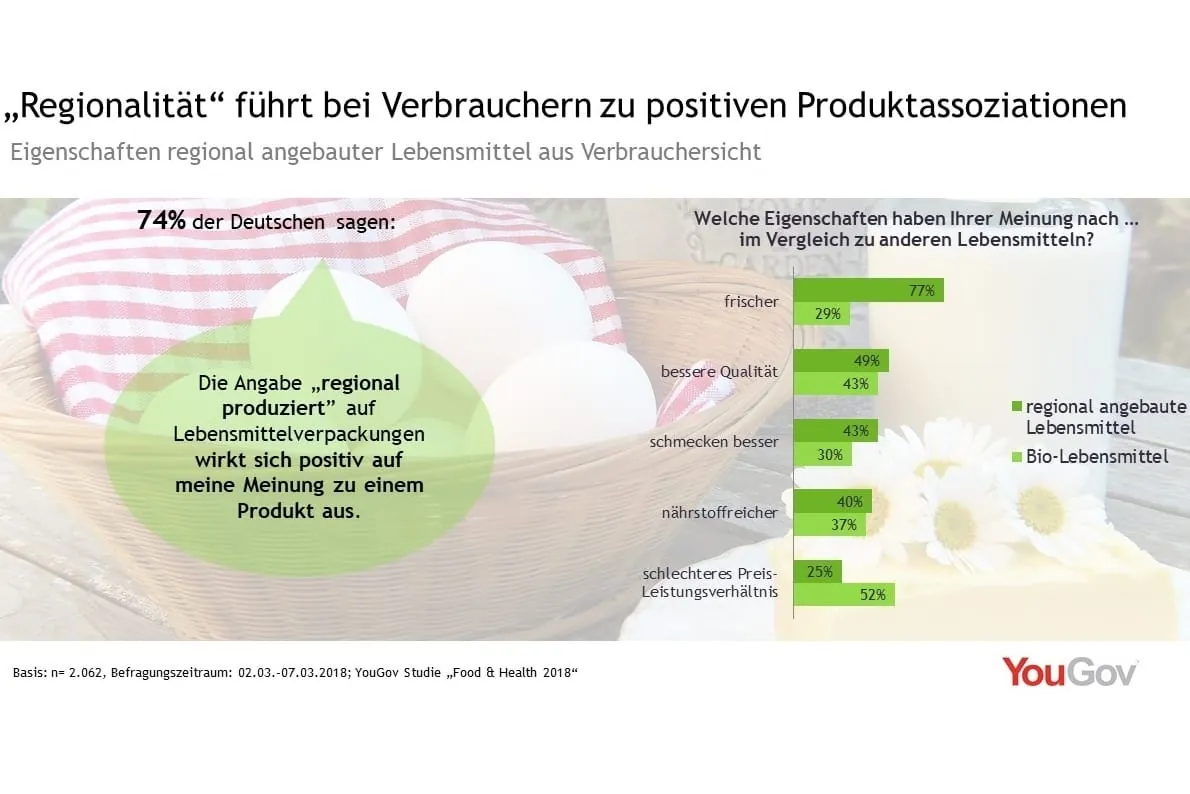 Drei Viertel (74 Prozent) der Deutschen geben zudem an, dass die Bezeichnung „regional produziert“ auf Lebensmittelverpackungen sich positiv auf ihre Meinung zu einem Produkt auswirkt. Wenn auf Produkten die Bezeichnung „regional“ steht, werden sie von 77 Prozent der Befragten als frischer als andere Lebensmittel wahrgenommen. Nur 29 Prozent haben diese Assoziation bei Lebensmitteln, die mit der Bezeichnung „Bio-Lebensmittel“ etikettiert sind. Auch schreibt die Hälfte (49 Prozent) der Befragten regional angebauten Lebensmitteln eine bessere Qualität zu (im Vergleich zu 43 Prozent bei Bio-Lebensmitteln). Der Geschmack (43 Prozent vs. 30 Prozent) und die Reichhaltigkeit an Nährstoffen (40 Prozent vs. 37 Prozent) wird ebenfalls bei regionalen Produkten besser eingeschätzt als bei Bio-Produkten.