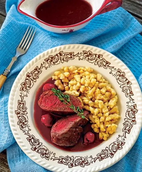 Die Spätzle mit den Rehmedaillons und der Kirschsauce servieren.