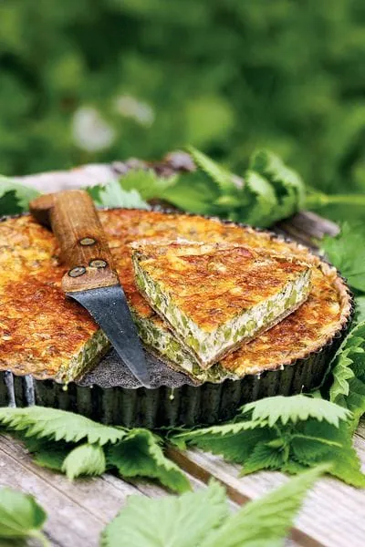 Die Quiche mit Brennnesseln und grünen Erbsen ist eine schmackhafte Beilage zu Fleischspezialitäten vom Grill. © Linda Louis aus dem Buch „Wilde Waldküche“/Hädecke Verlag - © © Linda Louis aus dem Buch „Wilde Waldküche“/Hädecke Verlag
