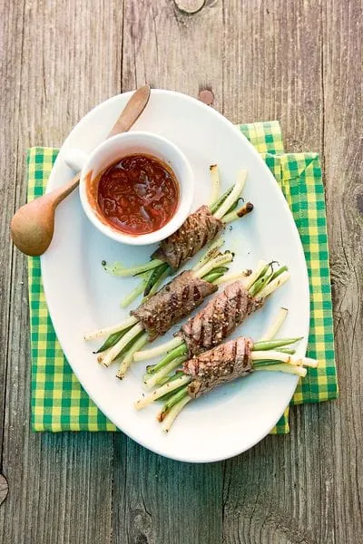 Die Zahnstocher oder Nadeln entfernen und die Röllchen mit der Sauce servieren.