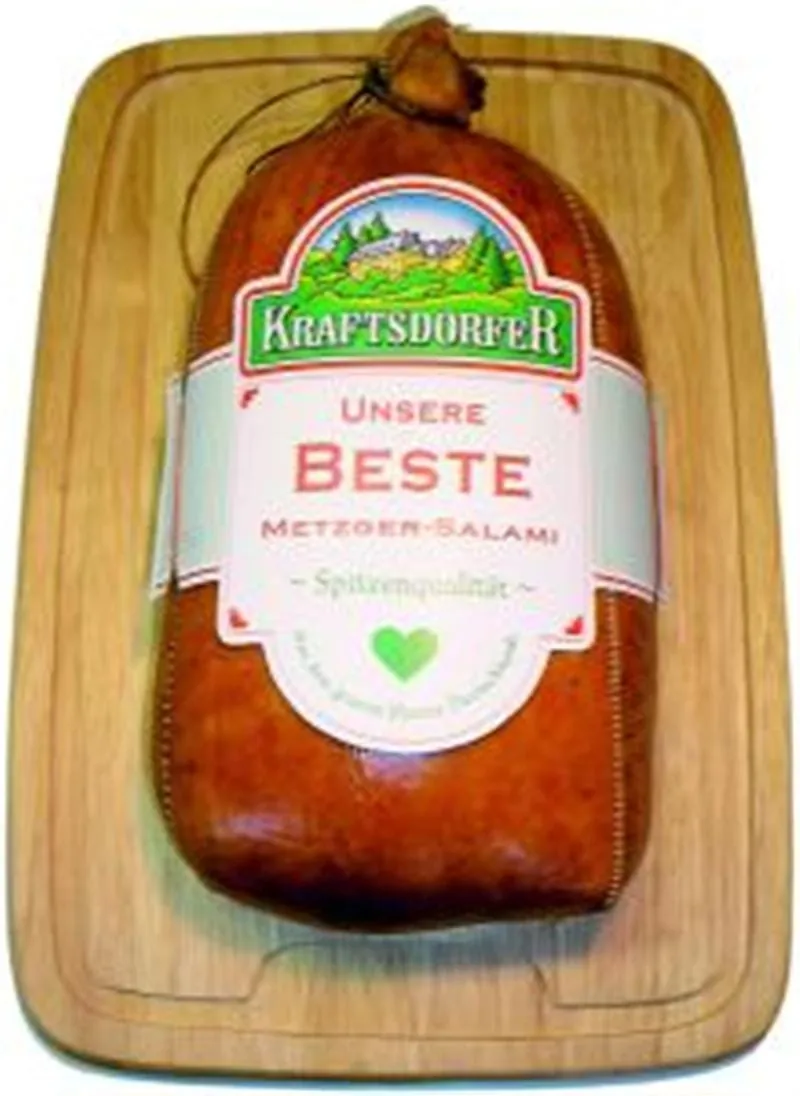 Das Sortiment umfasst rund 30 verschiedene Salamiartikel, die sowohl den Anforderungen für den Verkauf in SB-Märkten als auch im Fleischer-Fachgeschäft gerecht werden. Die neueste Salamikreation für die Theke ist die „Beste Metzger-Salami“. Als klassische Dauerwurst wird sie mit Rum, Pfeffer, Coriander und anderen Naturgewürzen abgeschmeckt, in genähte Fettenden gefüllt und flachgepresst. Auf einem rustikalen Brett in Folie eingeschweißt, kann diese Spezialität im Fleischer-Fachgeschäft ansprechend präsentiert werden. Gegebenenfalls zusammen mit weiteren Kraftsdorfer Salamispezialitäten in Kasten- und Brotform.