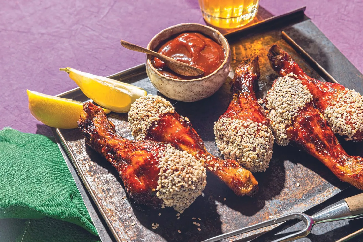 Alle Zutaten für den Rub in einer Schüssel vermengen. Die Hähnchenunterkeulen vollständig mit dem Rub einreiben und 3 bis 4 Stunden ziehen lassen. Den Ofen auf 160 Grad vorheizen und die Keulen auf einem Blech für 50 bis 60 Minuten im Ofen garen. Die Keulen aus dem Ofen nehmen und gleich mit der Develey-­Barbecue-Sauce einpinseln. Zurück in den Ofen geben und etwa zehn Minuten bei 180 Grad weiter garen, bis die Drumsticks schön glänzen. Sesam in ein Glas geben und die gegarten Drumsticks vorsichtig mit dem dickeren Ende eintunken. Drumsticks auf einem Holzbrett mit Zitronenspalte, Beilage und Barbecue-­Sauce zum Dippen anrichten.