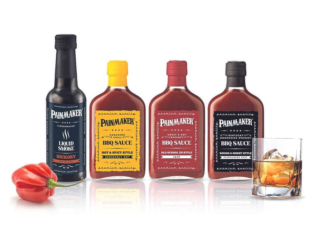 Ob süß, pikant oder feurig scharf – die drei Variationen in den Sorten „Painmaker Sweet & Hot Whiskey BBQ Sauce“, „Painmaker Kentucky Moon­shine Whiskey BBQ Sauce“ und „Painmaker Habanero Chili BBQ Sauce“ verleihen Fleisch, Gemüse und Fingerfood eine vollmundige Würze. Der Name „Painmaker“ kommt dabei nicht von ungefähr: Die drei Saucen und der Liquid Smoke stellen die Geschmacksnerven mit ihrer Schärfe und feinen Rauchnoten auf eine ganz besondere Probe. Hergestellt aus Chipotle, roten Habaneros und Hagebuttenkonfitüre sowie verfeinert mit Whiskey, bieten die Painmaker BBQ Saucen ein authentisches Geschmackserlebnis im amerikanischen Stil. Dabei sind sie vielseitig einsetzbar – zum Marinieren, Glacieren, Würzen und Verfeinern, als Dip oder Steaksauce. Der „Liquid Smoke“, eine Kombination aus Raucharoma, Sojasauce und Zwiebelnoten, verleiht Marinaden und Saucen einen intensiv rauchigen Geschmack.