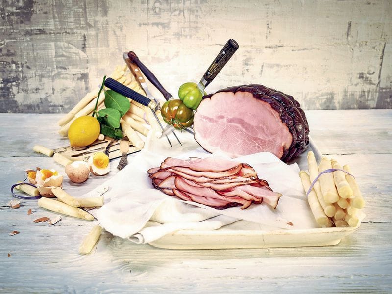 Es muss nicht immer Schwein sein: Besonders gut mit Spargel harmoniert der Rindersaftschinken. Aus mageren Keulen junger Rinder geschnitten, wird er von Bedford mild gepökelt, im Netz über Buchenholzspänen dunkel geräuchert und gegart. Mit nur 2 g Fett ist der zart-saftige Schinken besonders bekömmlich.