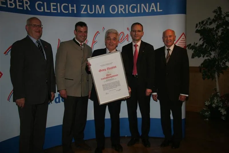 Georg Kleeblatt verabschiedete sich nach zehneinhalbjähriger Amtszeit als Landesinnungsmeister. Für seine Verdienste um das bayerische Fleischerhandwerk wurde er bereits 1992 mit der Goldenen Ehrennadel des Fleischerverbandes Bayern und 1993 mit dem Bundesverdienstkreuz am Bande ausgezeichnet. Nun wurde er als Dank und Anerkennung zum Ehrenlandesinnungsmeister ernannt.