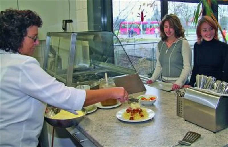 Es ist 12.35 Uhr. Sieben Schüler stehen brav in einer Schlange. Jeder schiebt ein Tablett vor sich her. Auf der anderen Seite des Fensters steht Uschi Ostermaier und reicht die gefüllten Teller an die einzelnen Schüler. An diesem Donnerstag gibt es Spagetti Bolognese und vegetarische Krautkrapfen. Die Jungen und Mädchen stellen die Teller auf die Tabletts, nehmen sich Besteck und suchen sich in der gut gefüllten Mensa des Joseph-Bernhart-Gymnasiums im bayerischen Türkheim einen Platz.