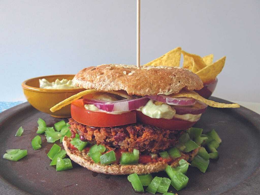 Patties aus Hülsenfrüchten harmonieren perfekt mit Brötchen. Kommen noch Käse, Ei, Quark- oder Joghurtdip dazu, ist ein vegetarischer Burger so vollwertig wie ein fleischhaltiger, schmeckt jedoch anders. Wer Fleisch­aroma im pflanzlichen Patty erwartet, dem bleiben nur industriell hergestellte, aromatisierte Erzatzprodukte. Die sind teuer, aufwendig produziert sowie ökologisch und ernährungsphysiologisch nicht immer empfehlenswert.