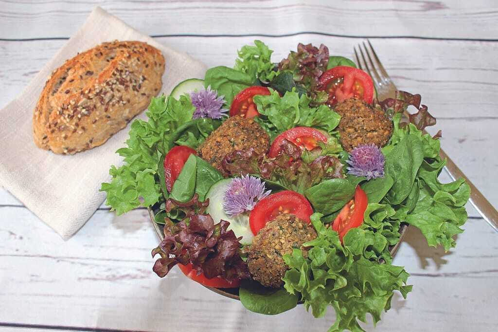 Salat geht immer. Falafel und Brötchen komplettieren ihn zu einem vollwertigen Snack oder einer leichten Mahlzeit. Für Fleischfans Hackbällchen anbieten. - © Barbara Krieger-Mettbach