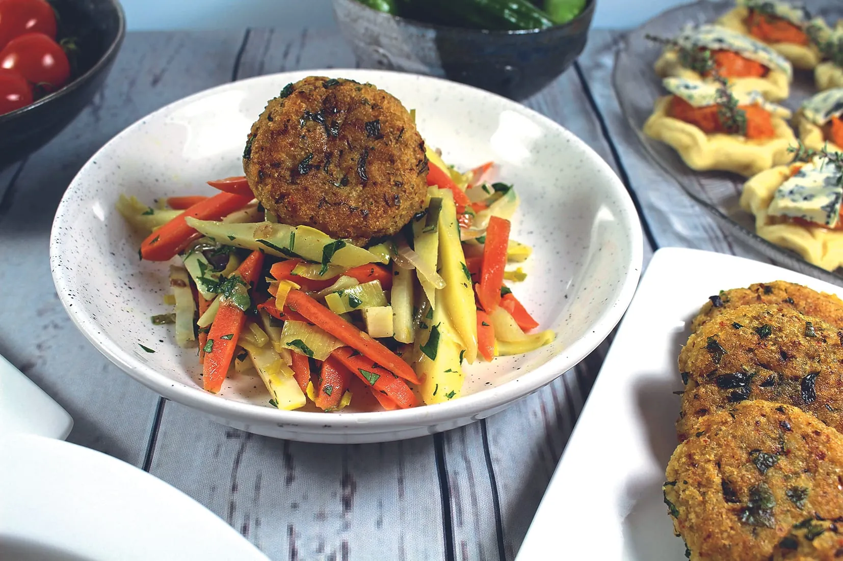 Zusammen mit Gemüse entsteht eine leichte Mahlzeit. Getreidepuffer sind reich an Ballaststoffen, langkettigen Kohlenhydraten und pflanzlichem Protein. - © Barbara Krieger-Mettbach