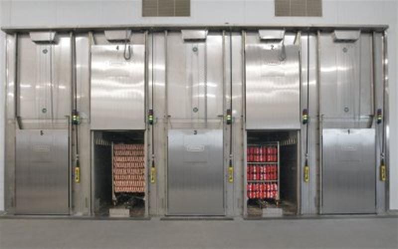 Ergänzt wird das Vemag-Anlagenprogramm für die Brüh- und Kochwurstherstellung durch Koch- und Intensivkühlanlagen im Batchverfahren. Darüber hinaus bietet der Hersteller zur weiteren Prozessoptimierung die Thermo-Verbund-Anlage als halbkontinuierliches System an. Dieses System besteht aus zwei miteinander verbundenen Sektionen: einem Aeromat als Räucher- und Kocheinheit und einer nachgeschalteten Intensivkühlanlage zum Duschen, Kühlen und Abtrocknen der Ware. Die beiden Sektionen sind durch automatisch arbeitende Türen getrennt und die Rauchwagen werden aus der Wärmebehandlung in die Kühlzone transportiert. Bei allen Anlagen werden die Prozessfunktionen automatisch überwacht, gesteuert und bei Bedarf verwaltet.