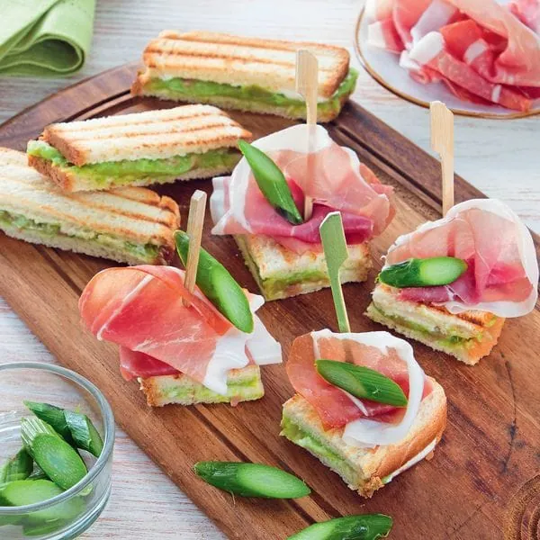 Spargel hat Saison: Ob grün oder weiß, spätestens am 24. Juni ist Schluss mit dem beliebten Frühlingsgemüse. Bis es so weit ist, kann man die knackigen Stangen aber in verschiedenen Variationen genießen. Beispielsweise als Sandwichversion mit Spargel-Parmesan-Creme und Parmaschinken.