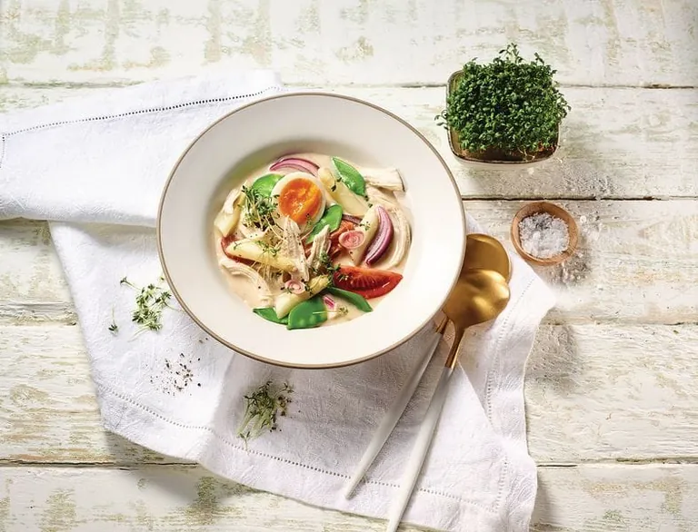 Auch optisch ein Genuss: Die helle Spargelsuppe wird mit grünen Zuckerschoten, ­roten Zwiebeln und Tomate aufgepeppt. Deutsches Geflügel - © Deutsches Geflügel