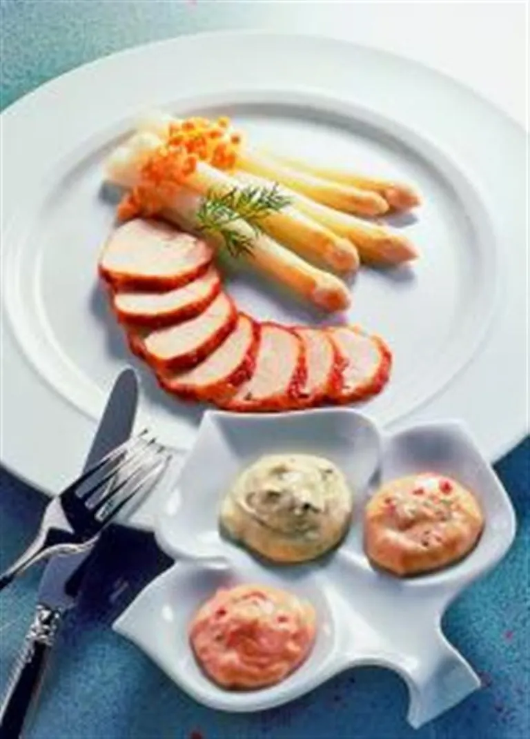 Zum Spargel mit Huhn passen Dips aus Paprika-quark und Kräuter-Crème-fraîche. - © Wirths PR