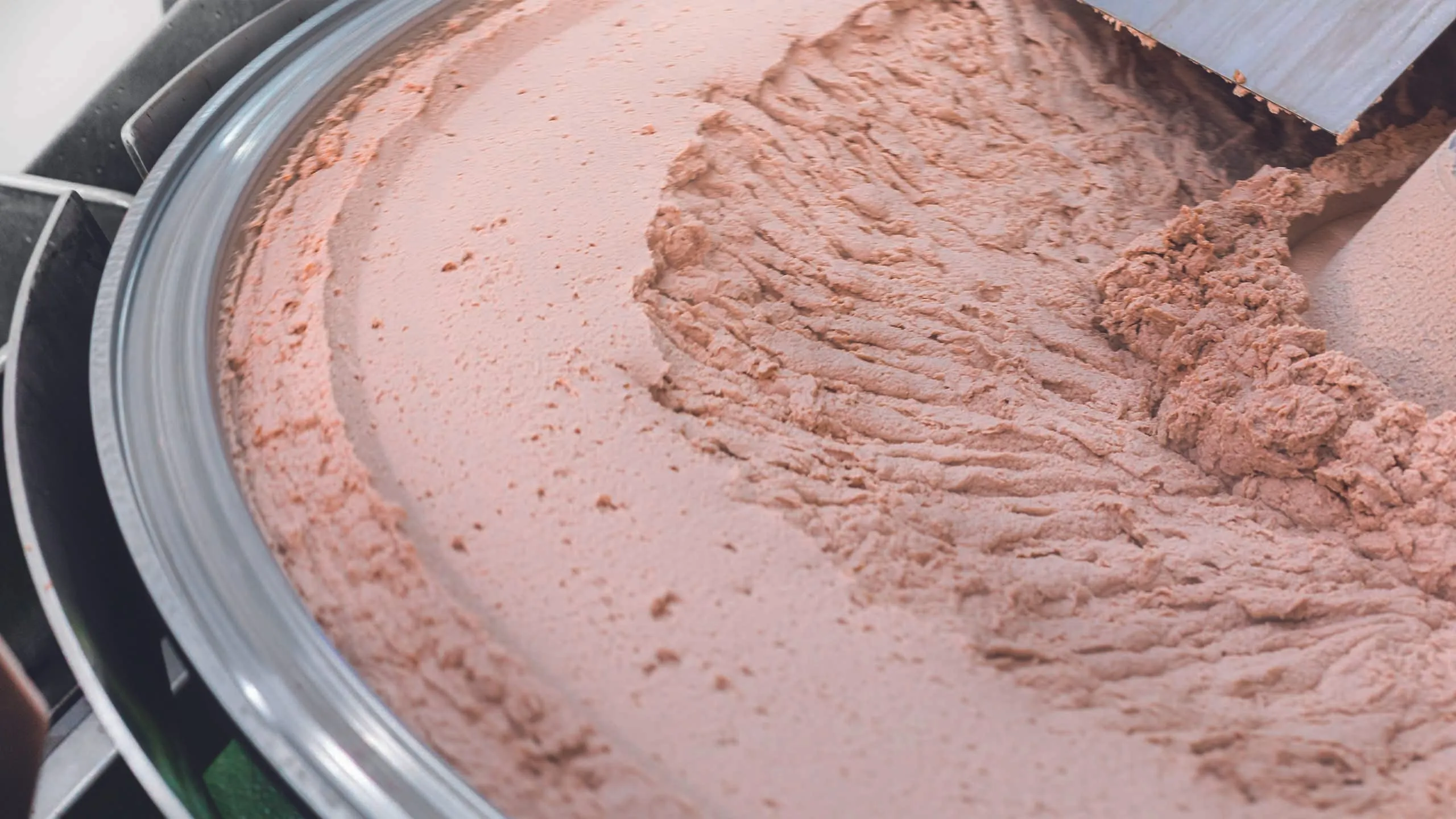 Im Anschluss sorgt der offene Kochkutter dank der doppelwandigen Schüssel auch dafür, dass das Brät schnell auf die für die Weiterverarbeitung erforderlichen 45 °C abkühlt: Durch den Schüsselzwischenraum fließt kaltes Wasser und das Brät ist schnell bereit für den letzten Verarbeitungsschritt im Kutter: In die Schüssel kommt nun zusätzlich noch die vorbereitete Lebermasse und wird einige Minuten lang schonend eingearbeitet. Hier bewährt sich der erhöhte Schüsselrand, der bei allen Kuttern von K+G Wetter Standard ist: Obwohl sich gut 360 Kilo Brät in der 360-Liter-Schüssel drehen, schwappt nichts über. Das Ergebnis von Technik und Handwerkskunst: Fein glänzendes, perfekt gebundenes Brät, das schon bald fertig abgefüllt in der Magnus-Bauch-Metzgertheke nebenan liegt und später auf dem Brotzeitbrett der Kunden für genussvolle Momente sorgt.