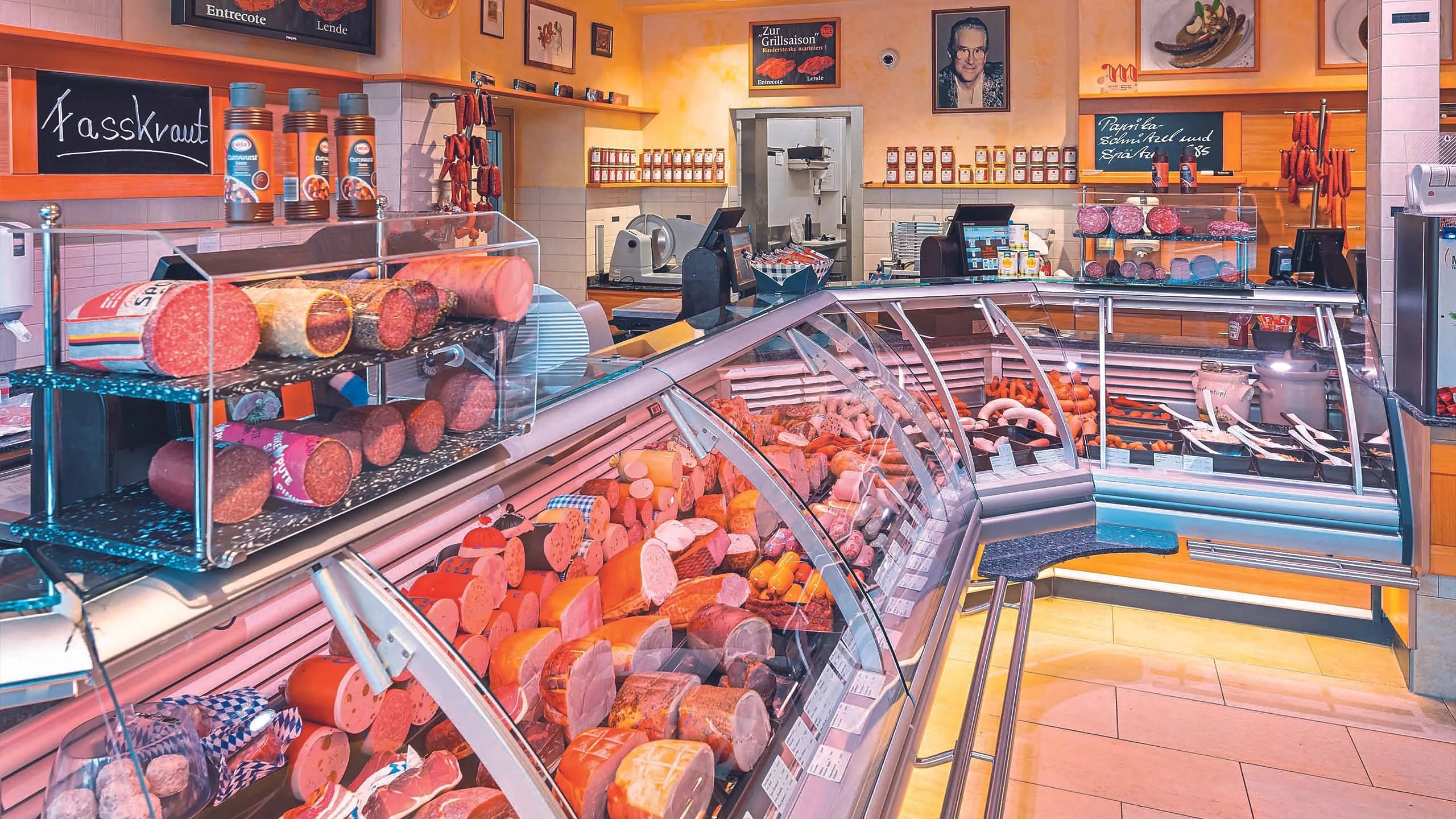 Die Ladenfront in der Thalkirchener Straße ist klassisch-schlicht, rote Neonschrift, rechts der Eingang zur Metzgerei mit Imbiss, links eine schmale Tür zum Händlerbereich. Erst weiter hinten ist zu erahnen, wie groß die Metzgerei Magnus Bauch wirklich ist. Über die gesamte Fläche zweier großer Stadthäuser erstrecken sich die Produktionsräume – und zwei Stockwerke tief in den Münchner Untergrund. Seit mehr als 70 Jahren entstehen hier Fleischspezialitäten für Läden, Wirte und Kunden aus München und bis weit ins Umland: Dank der Metzgerei Magnus Bauch freuen sich Gäste vom Löwenbräuzelt auf der Wiesn über die Käfer-Märkte bis hin zu den Snack-Theken bei Münchner Bäckern tagein tagaus über Leckeres aus der Wurstküche. Und weil Bayrisch-Deftiges und die Oktoberfest- und Biergartenkultur auch international beliebt sind, schmecken Weißwurst und Leberkäs, Bratwurst und Brotzeitplatten von Magnus Bauch mittlerweile auch Gästen von London bis Grenoble.